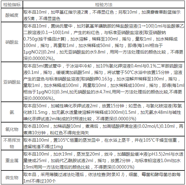 1)总体性状要求:本品为饮用水经馏法、离子交换法、反渗透法或其他适宜的方法制得的无色、无臭,无味的澄清液体,不含任何添加剂
